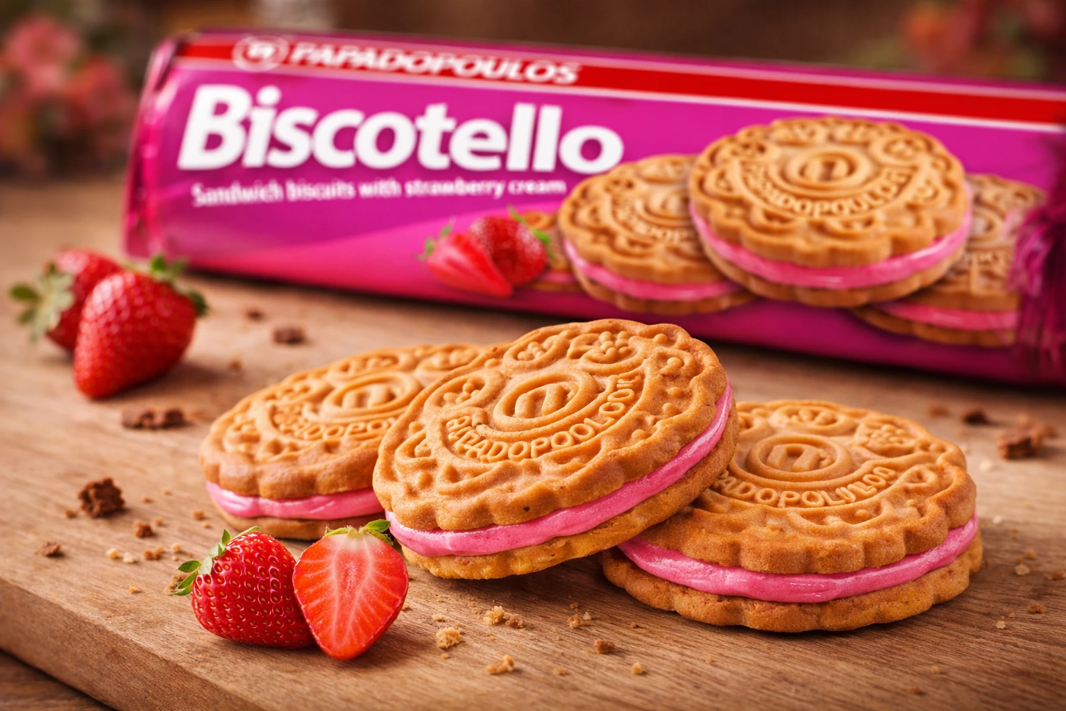 «Biscotello» от греческого бренда Papadopoulos — это хрустящие круглые печенья с нежной клубничной кремовой начинкой. Лёгкая текстура печенья и мягкий фруктовый крем создают приятный баланс сладости и ягодной свежести.