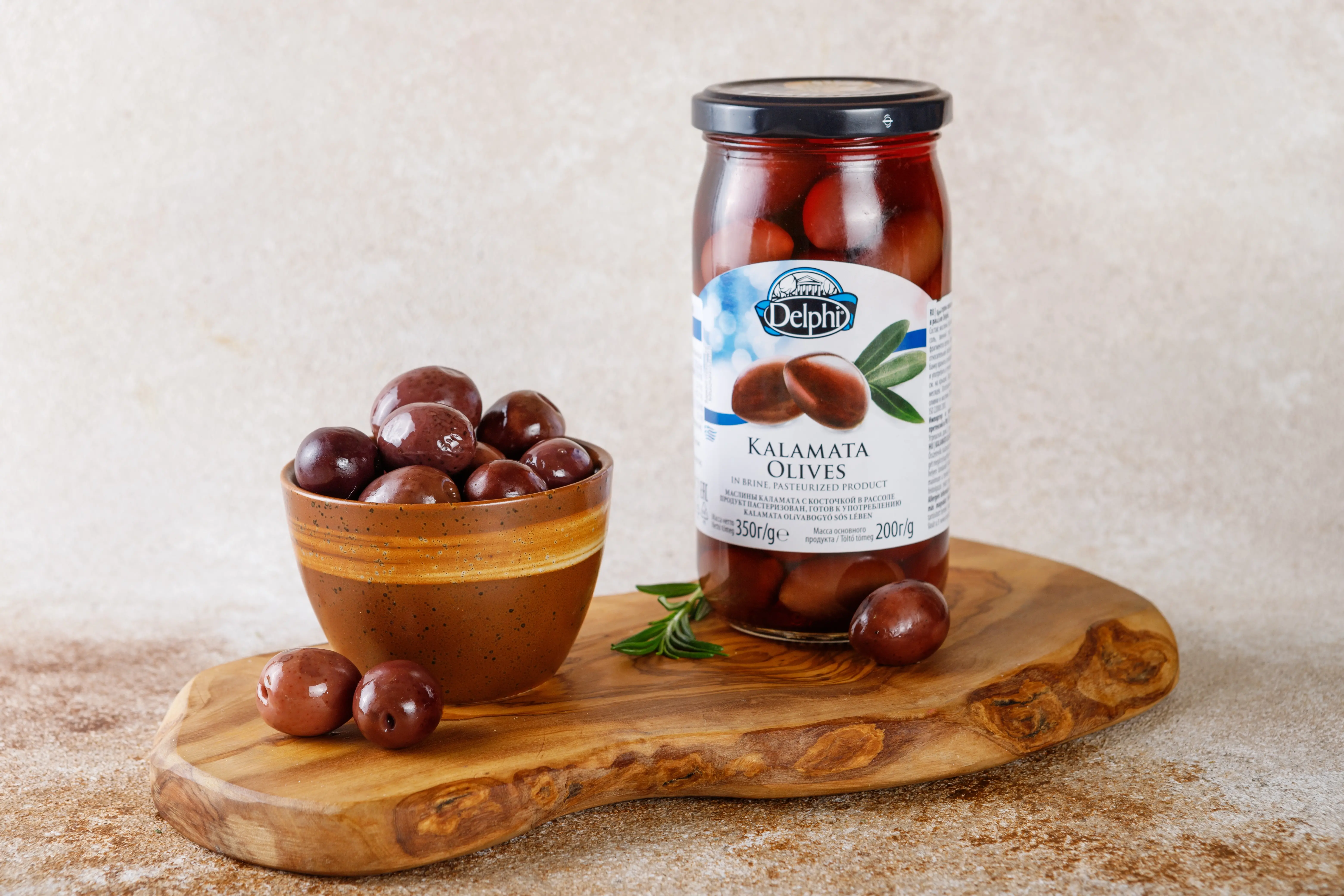 Маслины сорта Каламата DELPHI — насыщенные, мясистые, тёмно-бордовые, с характерной фруктово-винной ноткой и лёгкой кислинкой. Косточка сохраняет вкус более цельным и выразительным — именно так, как любят в Греции.