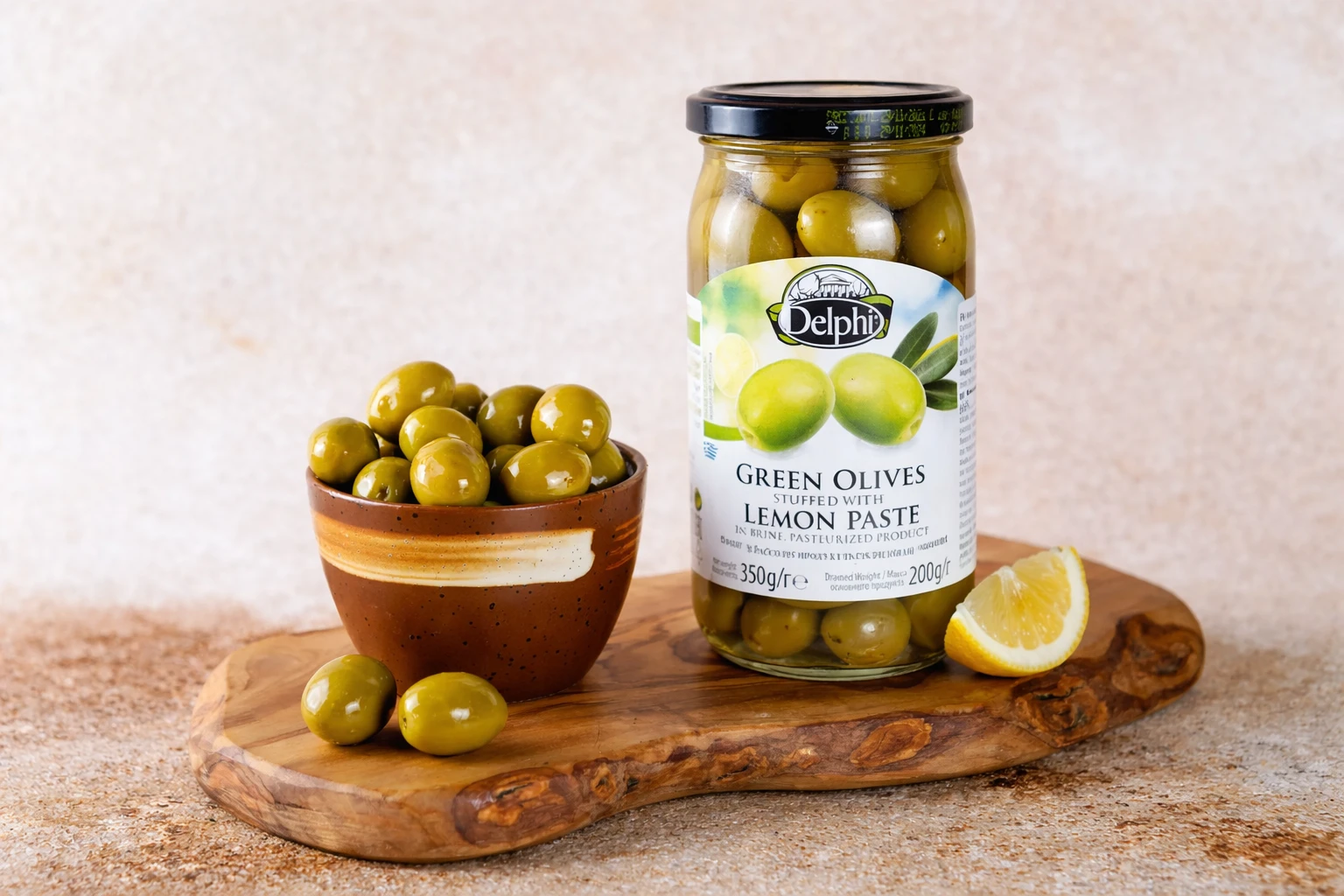 Для производства используются отборные оливки, собранные вручную в Северной и Центральной Греции. Их аккуратно фаршируют ароматной пастой из лимона, которая придаёт вкусу лёгкую кислинку, свежесть и изящную пикантность.