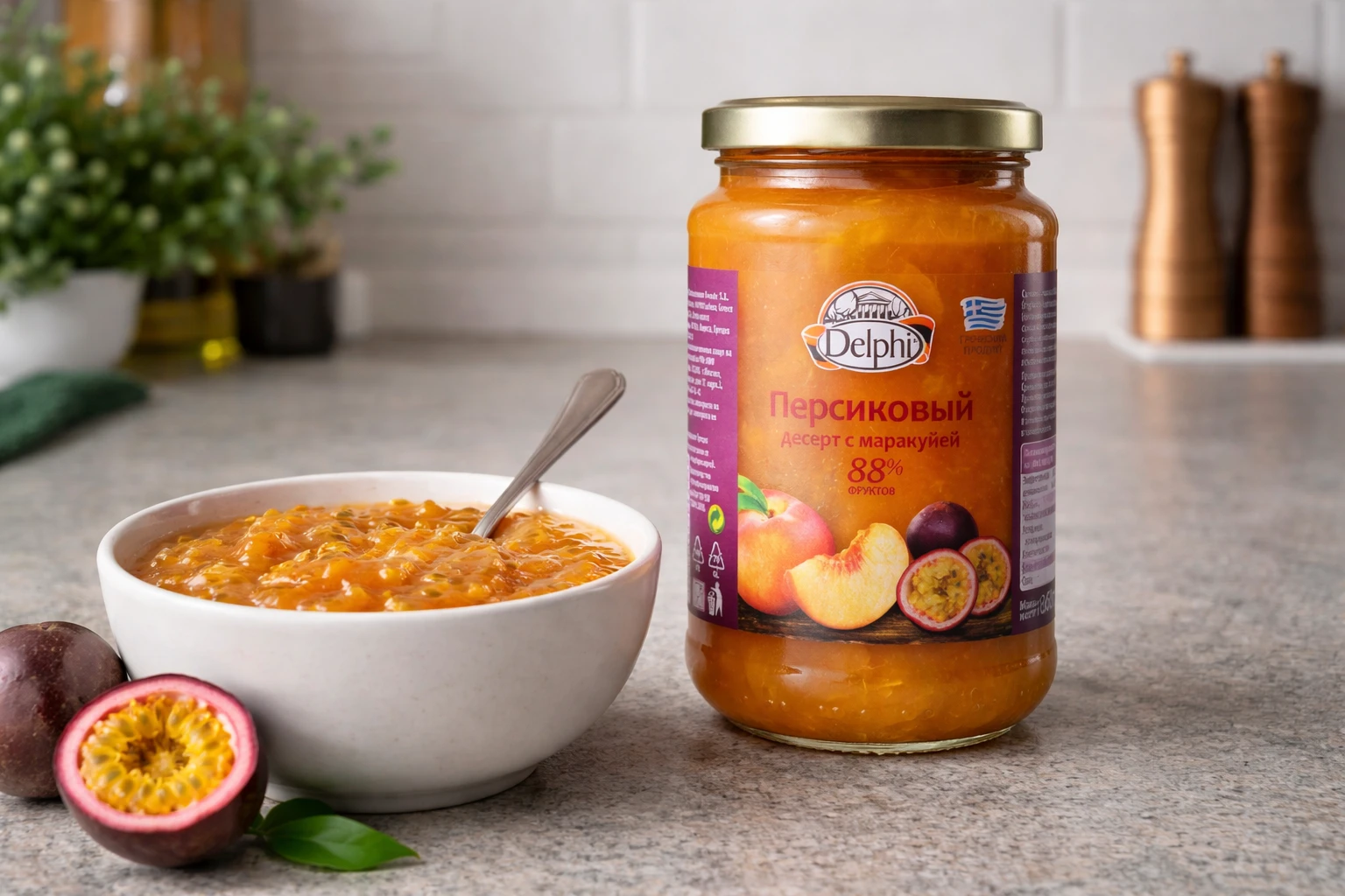 Фруктовая основа делает десерт натуральным и лёгким: здесь нет избыточной сладости, а вкус раскрывается живо и многогранно — сначала мягкая сладость персика, затем освежающая кислинка маракуйи.