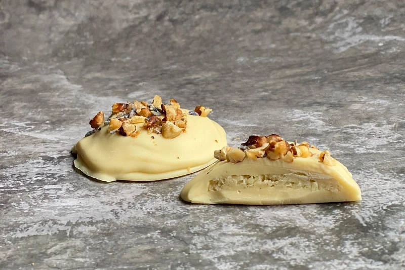 Сырный медиант «Пармезан - Лаванда» изготовлен вручную из белого бельгийского шоколада с добавлением ароматной лаванды и сливочной начинки с кусочками сыра Пармезан.