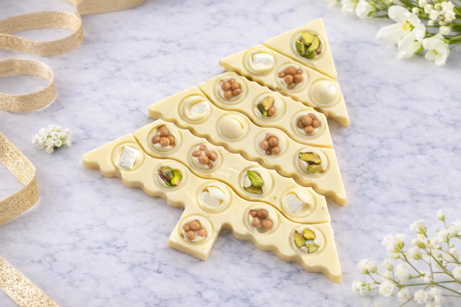 ✨ Шоколадная ёлка из специальной коллекции — маленькое гастрономическое чудо, созданное, чтобы дарить настроение. Нежный белый бельгийский шоколад 🍫 сочетается с карамельными криспами для лёгкого хруста, фисташкой 💚 для благородной ореховой ноты и мягкими маршмеллоу, которые тают почти мгновенно ☁️.