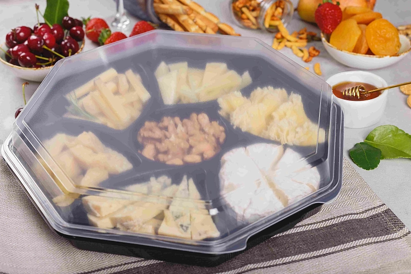 Сыры укладываются в менажницы с глубокими отсеками, которые не позволяют продукции перемешаться между собой.