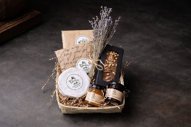 Набор приезжает в уютной плетёной шпонке, аккуратно упакованной в прозрачную плёнку.