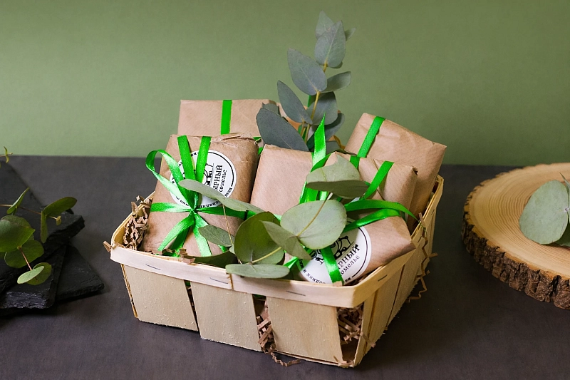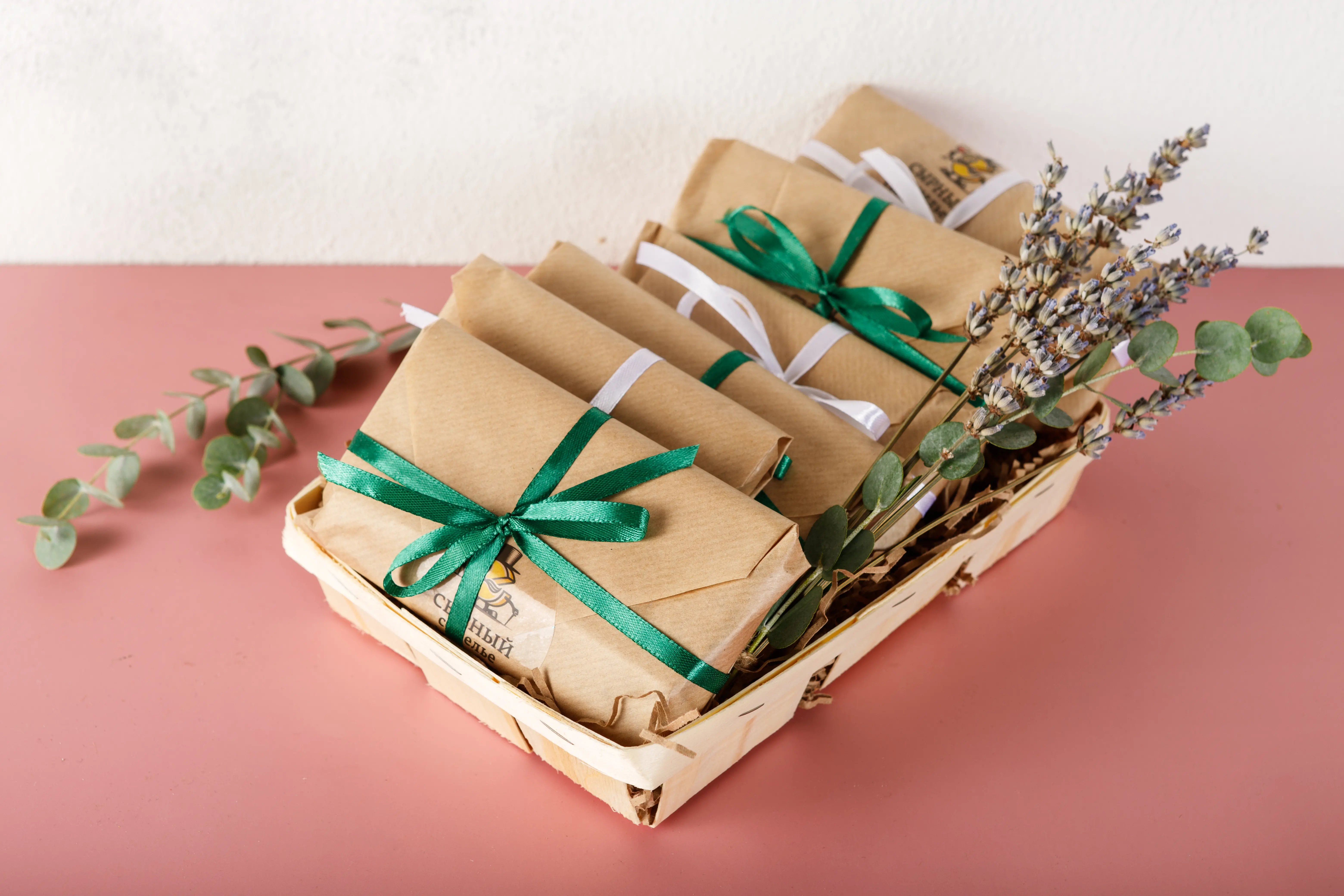 Набор приезжает в уютной плетёной шпонке, аккуратно упакованной в прозрачную плёнку.
